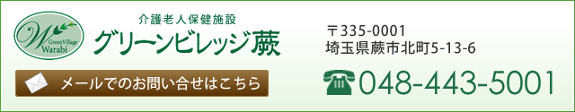 埼玉県蕨市の介護老人保健施設「グリーンビレッジ蕨」です。入所サービス以外にも通所リハビリテーション(デイケア)、短期入所療養介護(ショートステイ)、訪問リハビリテーションサービスのご提供も行っております。