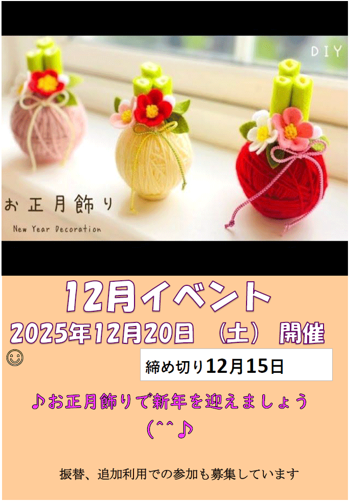 2025年12月20(土)施設行事(お祭り)のお知らせ 投稿日 2025年12月10日 著者 TMG本部管理者 カテゴリー ニュース 注意事項 お祭り当日の面会および洗濯物交換・日用品のお渡しは中止と致します。また、当日は施設営業時間を17時迄とさせて頂きます。 この記事を書いた人 TMG本部管理者 記事一覧 ウェブサイト
